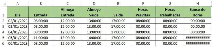A princípio pode parecer que não tem lógica falar em horas negativas, mas acredite, em alguns casos você pode precisar delas, como por exemplo, para calcular o saldo em um banco de horas, como no exemplo abaixo: