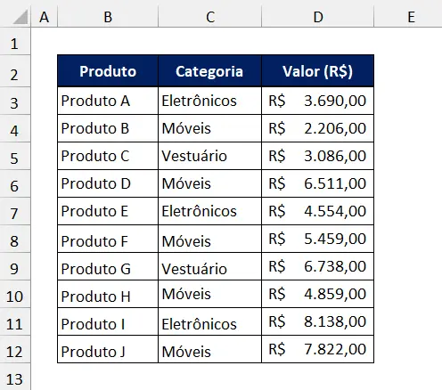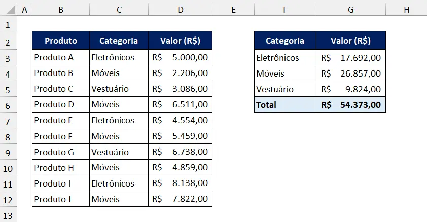 Suponha que temos uma tabela de vendas de uma loja conforme imagem abaixo, e nosso objetivo é agrupar as vendas por categoria e calcular a soma total de vendas para cada categoria de forma automática.