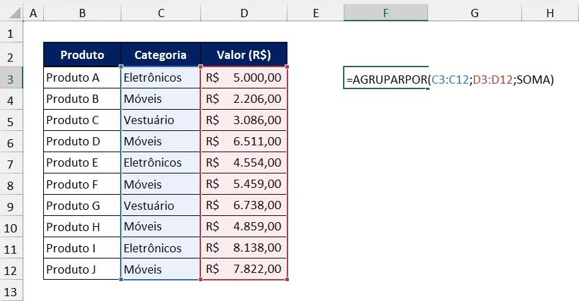 Primeiro, selecione a célula onde deseja que o resultado apareça, no exemplo selecionaremos a célula F3. Em seguida, insira a fórmula =AGRUPARPOR(C3:C12;D3:D12;SOMA)