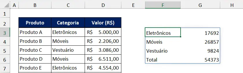 Pressione Enter e a função irá retornar a soma total das vendas para cada categoria, como mostrado abaixo: