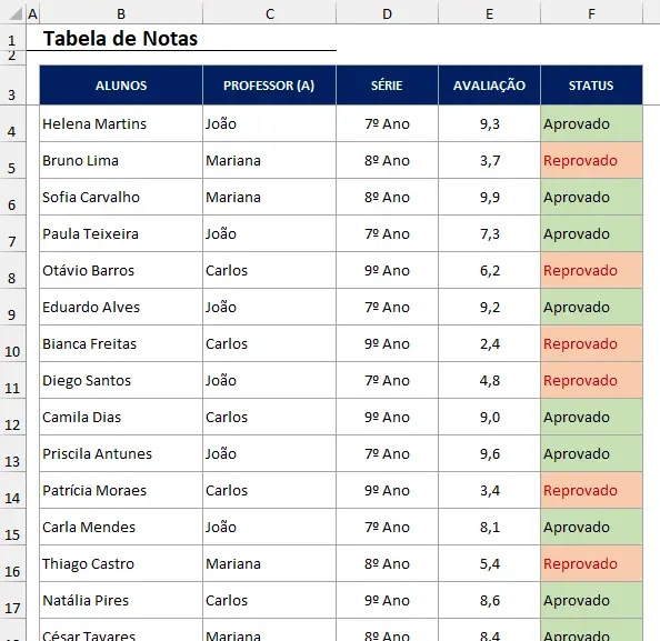 Imagine que você tem uma tabela de notas com as colunas: Alunos, Professor, Série, Nota e Status, conforme imagem abaixo: