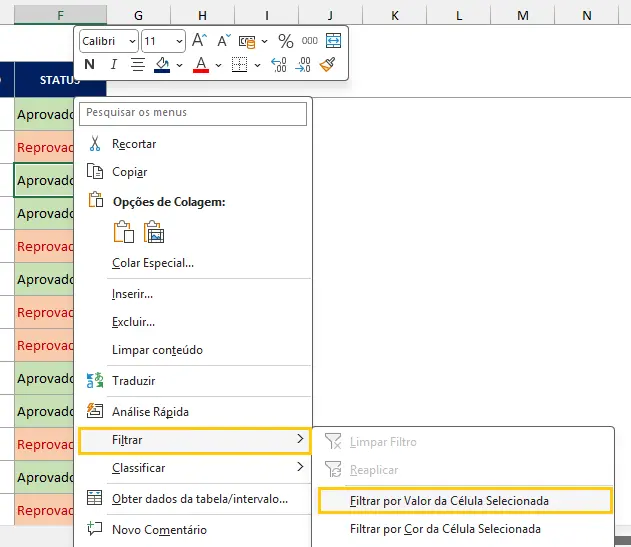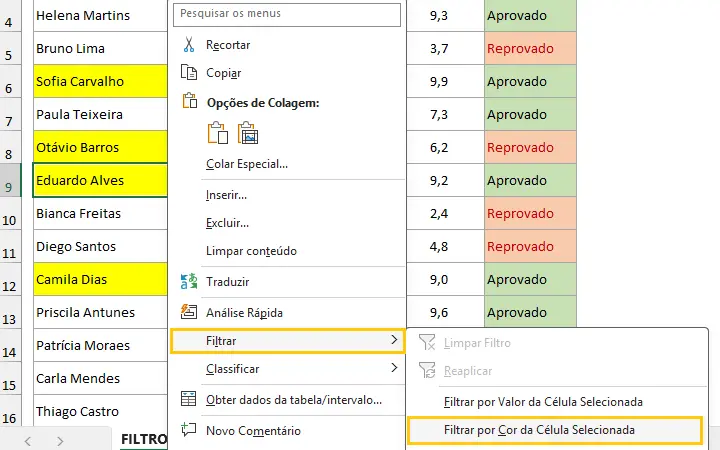 Agora você quer visualizar apenas os alunos aprovados. Clique com o botão direito do mouse sobre a célula onde aparece o status “Aprovado”. Em seguida, vá em Filtrar > Filtrar por valor da célula selecionada.