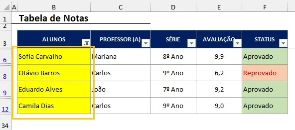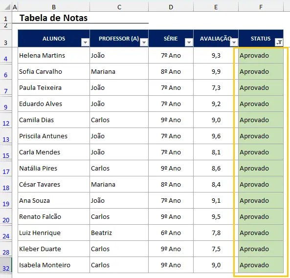 Pronto! O Excel vai exibir apenas os registros de alunos aprovados.