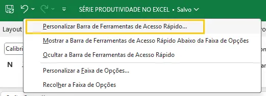 Clique com o botão direito na barra superior do Excel, e clique em “Personalizar Barra de Ferramentas de Acesso rápido”.