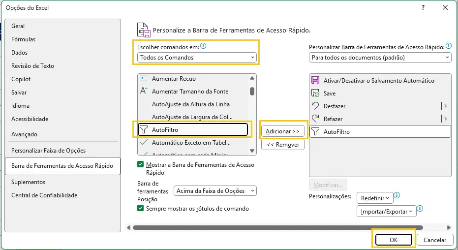 Vá em “Escolher comandos em”: e escolha a opção: “Todos os comandos”. Procure por “Autofiltro”, clique em “Adicionar” > OK.