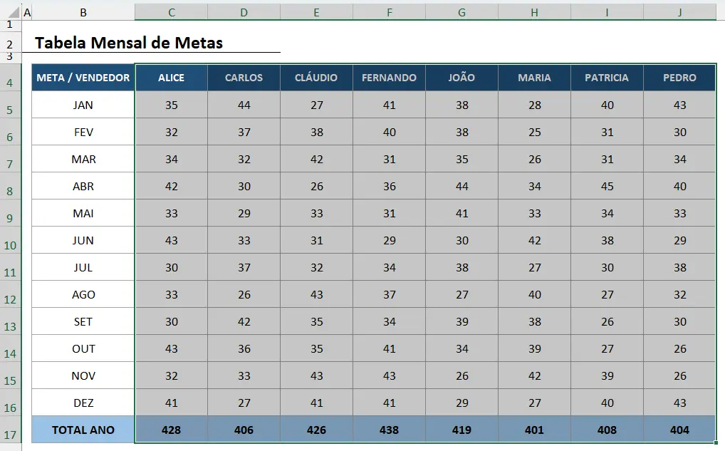 Neste exemplo prático, apresentaremos de forma detalhada o procedimento para classificar dados da esquerda para direita. Considere que você possui uma tabela de metas e pretende ordenar a linha 17, correspondente ao total geral, do valor mais alto para o mais baixo. Para isso, siga as orientações abaixo: