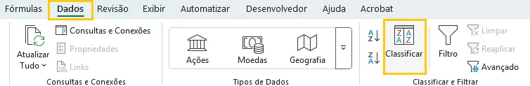 2. Vá até a aba “Dados” no menu do Excel, clique em “Classificar”.