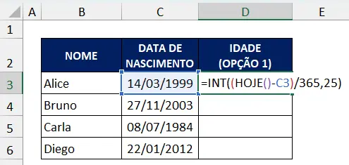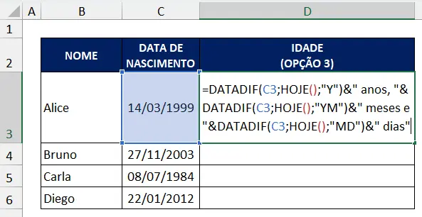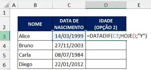 =SE(C3=””;””;DATADIF(C3;HOJE();”Y”))