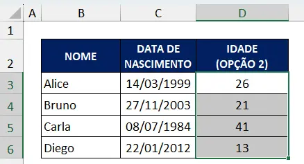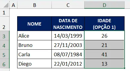 A forma mais precisa e popular para calcular idade no Excel. Nela usamos a função DATADIF aninhada a função HOJE. Esta fórmula retorna à idade em anos completos e atualiza automaticamente.