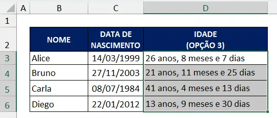 Se quiser detalhar a idade completa, você pode também utilizar a DATADIF indicando além dos anos, os meses e dias. Aplique da seguinte forma:
