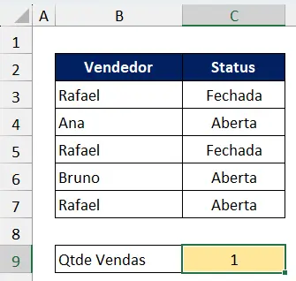 Resultado: 1 Ela conta apenas as vendas do Rafael e que estão com status Aberta.