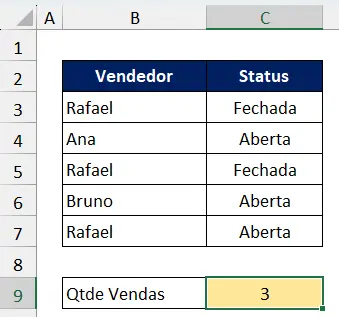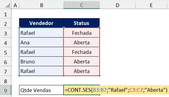 Neste exemplo, desejamos contar as vendas do Rafael que estão com o status aberto. Para isso aplique a função: =CONT.SES(B3:B7;”Rafael”; C3:C7;”Aberta”)
