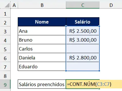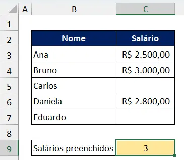 A função trará o resultado 3. Ela contou as células vazias, ou seja, que não possuem preenchimentos.
