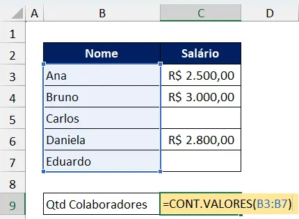 Considerando a mesma tabela anterior, se aplicarmos: =CONT.VALORES(B3:B7)