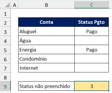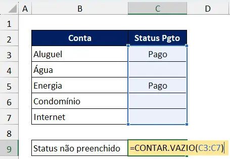 Imagine o seguinte controle de contas, e deseja contar apenas as células que não possuem status preenchidos. Se usar a fórmula: =CONTAR.VAZIO(C3:C7)