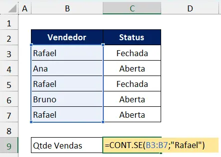Se quiser contar quantas vendas Rafael fez, aplique: =CONT.SE(B3:B7;”Rafael”)