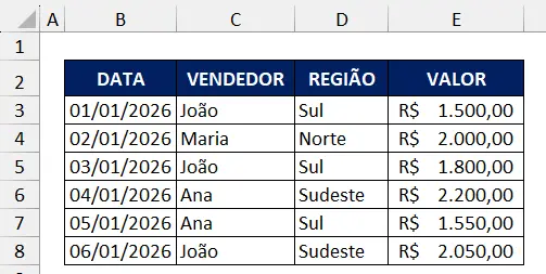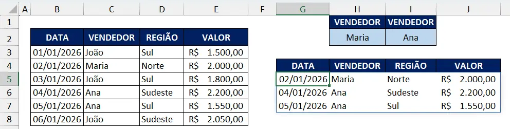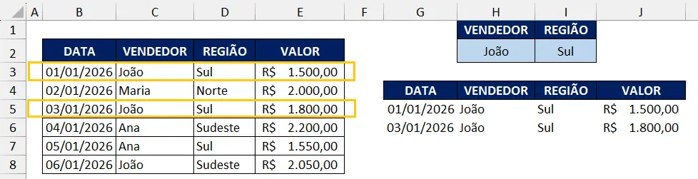 Pronto, após aplicada a função, apenas os registros onde João vendeu na região Sul serão apresentados.