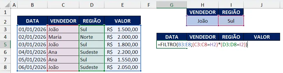 Neste exemplo, nosso objetivo é filtrar apenas as vendas do João na região Sul, conforme indicados nas células H2 e I2. Para isso, aplique a fórmula: =FILTRO(B3:E8;(C3:C8=H2)*(D3:D8=I2))