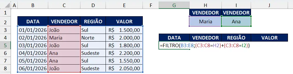 Neste segundo exemplo, desejamos filtrar as vendas do João OU da Maria. Para isso aplique a fórmula: = FILTRO(B3:E8;(C3:C8=H2)+(C3:C8=I2))