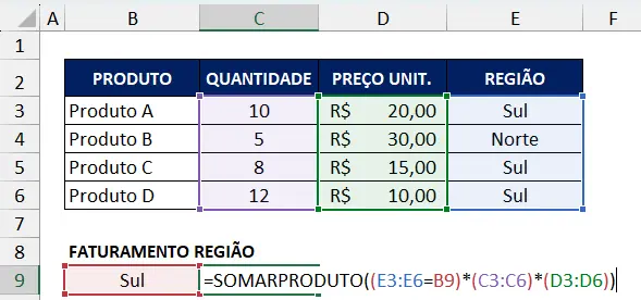 (E3:E6=B9) → intervalo da região, retorna 1 quando a referência for igual a célula B9, no exemplo “Sul”, e 0 para outros.