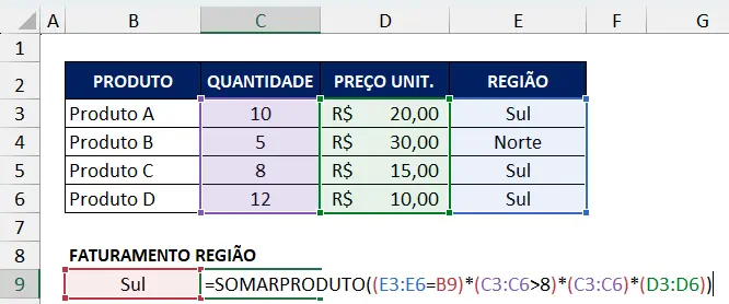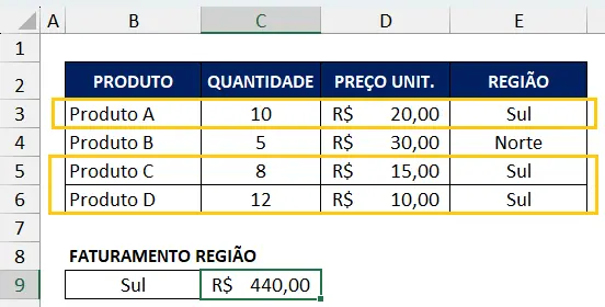 Você pode usar vários critérios ao mesmo tempo. Por exemplo, quer identificar novamente o faturamento da região Sul, porém apenas dos produtos com quantidade maior ou igual a 10.