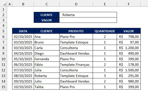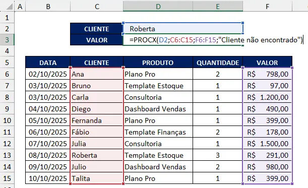 Se você quiser buscar automaticamente o valor da venda com base no nome do cliente digitado em outra célula, basta utilizar: =PROCX(D2;C6:C15;F6:F15;”Cliente não encontrado”)