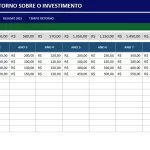 Pensando em sua necessidade de clareza e segurança, desenvolvemos uma planilha poderosa que calcula o retorno sobre o investimento (ROI) para projetos com prazo de retorno de até 10 anos. Com ela, você terá todas as respostas que precisa para tomar decisões informadas e seguras, com a estrutura abaixo: