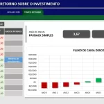 Além disso, essa aba traz o fluxo de caixa descontado, indicando exatamente em qual ano o projeto será pago e começará a gerar lucro. Uma caixa ao lado mostra a quantidade exata de anos, meses e dias necessários para o retorno do investimento.