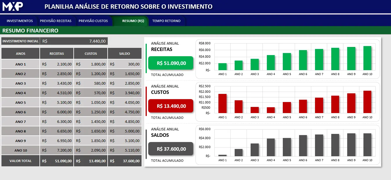 Aqui é apresentado um resumo financeiro em formato de tabela, com receitas, custos e saldo ano a ano. Para auxiliar na análise visual, três gráficos demonstram a evolução dos indicadores anualmente.