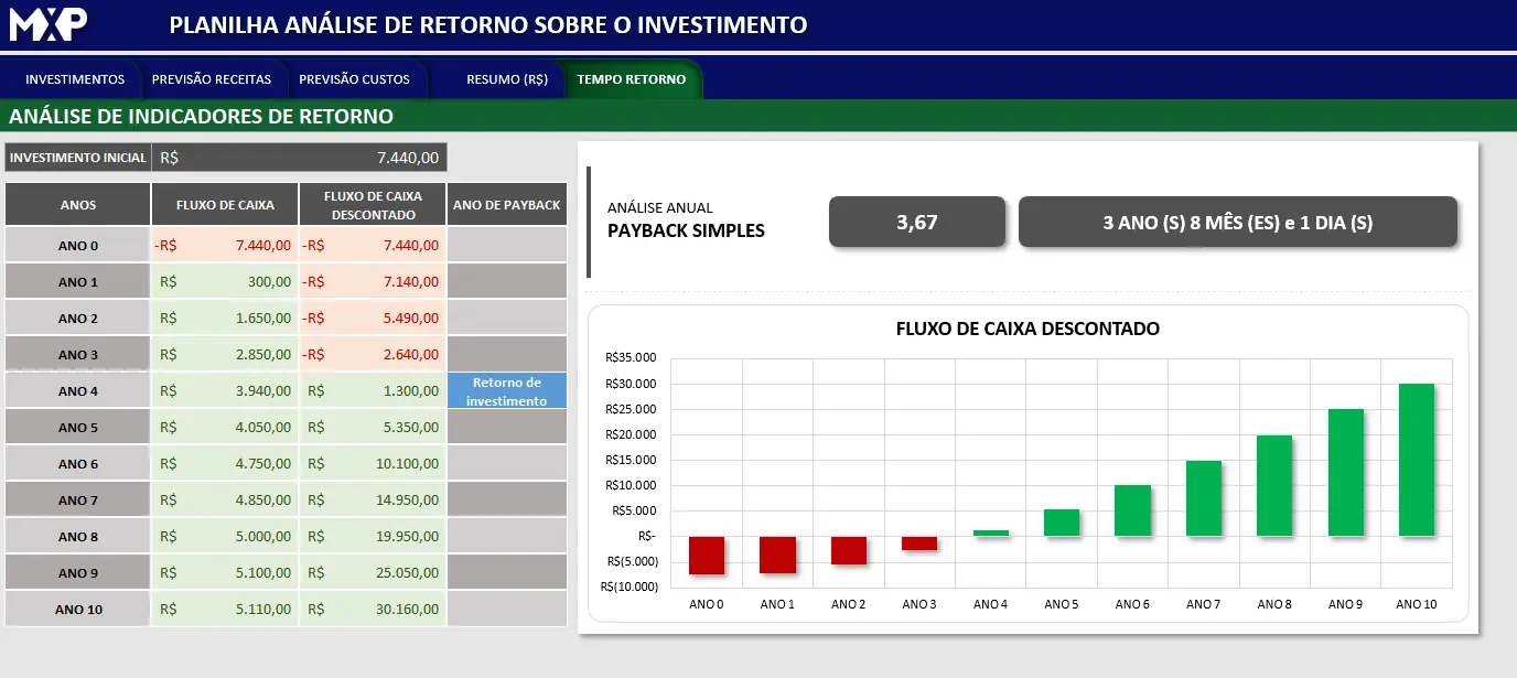 Além disso, essa aba traz o fluxo de caixa descontado, indicando exatamente em qual ano o projeto será pago e começará a gerar lucro. Uma caixa ao lado mostra a quantidade exata de anos, meses e dias necessários para o retorno do investimento.