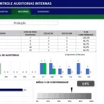 Nossa planilha oferece uma solução completa para o gerenciamento das suas auditorias internas. Controle auditorias realizadas, em atraso, canceladas, número de não conformidades apontadas, e muito mais através das funcionalidades descritas abaixo: