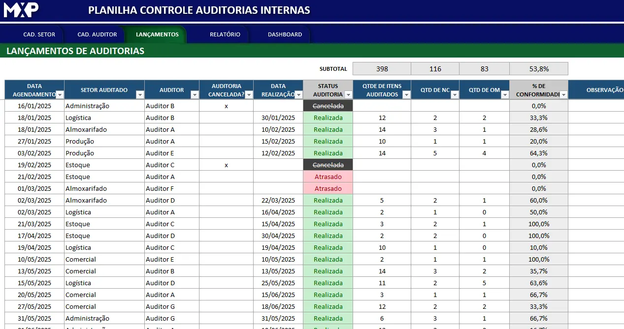 Agende e controle todas as auditorias nesta aba. Ao registrar cada auditoria, indique a data agendada, selecione um dos setores cadastrados, e selecione um dos responsáveis cadastrados. Se a auditoria for cancelada, marque com um “X” na coluna específica. Após a realização da auditoria, informe a data de realização, a quantidade de itens auditados, e também a quantidade de NC (não conformidades) e OM (oportunidades de melhorias) encontradas e inclua uma observação se necessário. A coluna de status da auditoria e percentual de conformidade são automáticas (colunas em cinza ou ocultas são automáticas, não altere ou apague as informações).