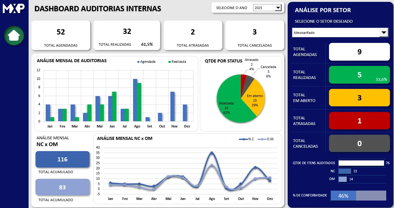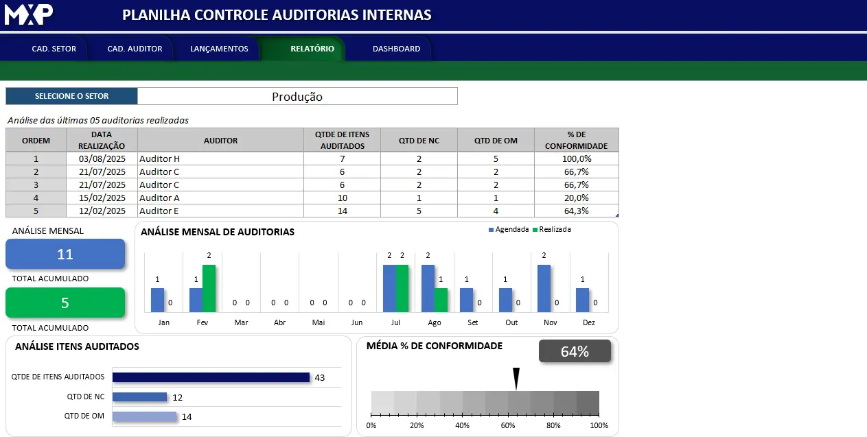 Selecione um setor cadastrado e analise-o individualmente. Obtenha de forma automática as 5 (cinco) últimas auditorias realizadas pelo setor, com data, auditor, a quantidade de itens auditados, a quantidade de NC (não conformidades) e OM (oportunidades de melhorias) encontradas e percentual de conformidade. Além disso, tenha uma análise geral mensal de auditorias realizadas e agendadas, análise gráfica das últimas auditorias referente as quantidades de itens auditados e média de conformidade (colunas em cinza ou ocultas são automáticas, não altere ou apague as informações).