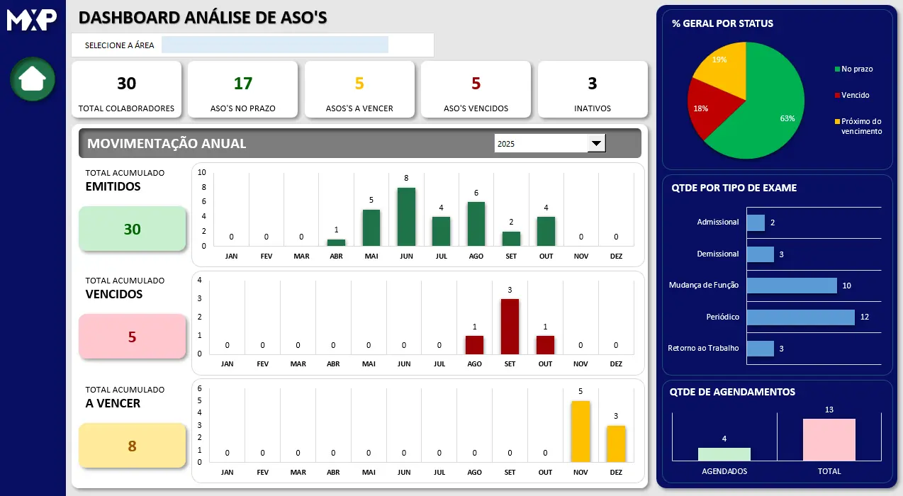 ✅ Dashboard visual com indicadores importantes, como ASOS’S pos status, análise mensal, tipo de exame e muito mais.