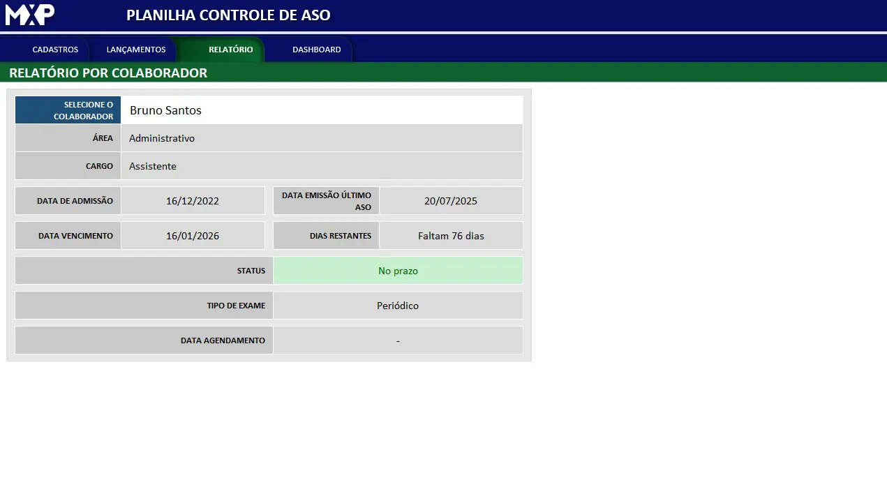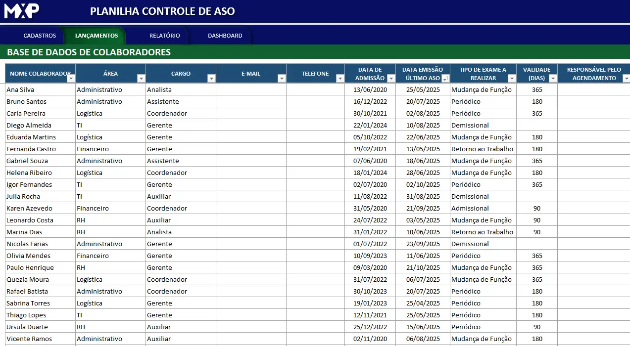 Registre cada ASO realizado, preenchendo informações como, dados de Colaborador (Nome, área, cargo, e-mail, telefone), data de admissão, data emissão último ASO, tipo de exame, validade em dias e status.
