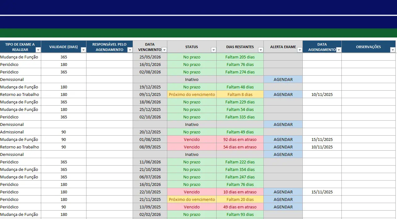 A Planilha de Controle de ASO dos Colaboradores foi desenvolvida para empresas que desejam manter um acompanhamento eficiente dos exames ocupacionais exigidos pelas Normas de Segurança do Trabalho. Com ela, você terá um controle completo dos ASOs (Admissional, Periódico, Demissional, Retorno ao Trabalho e Mudança de Função), garantindo organização, conformidade e redução de riscos trabalhistas.