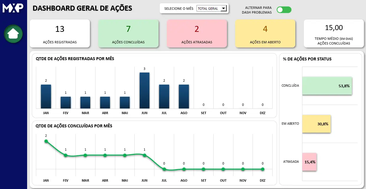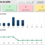 Indicadores e gráficos automáticos para visualização das ações e problemas registrados, é possível alternar entre dashboard com foco em ações e dashboard com foco nos indicadores relacionado aos problemas identificados.